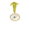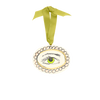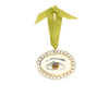 Each decoration is strung with luxurious Swiss satin chartreuse ribbon secured through a brass ring.